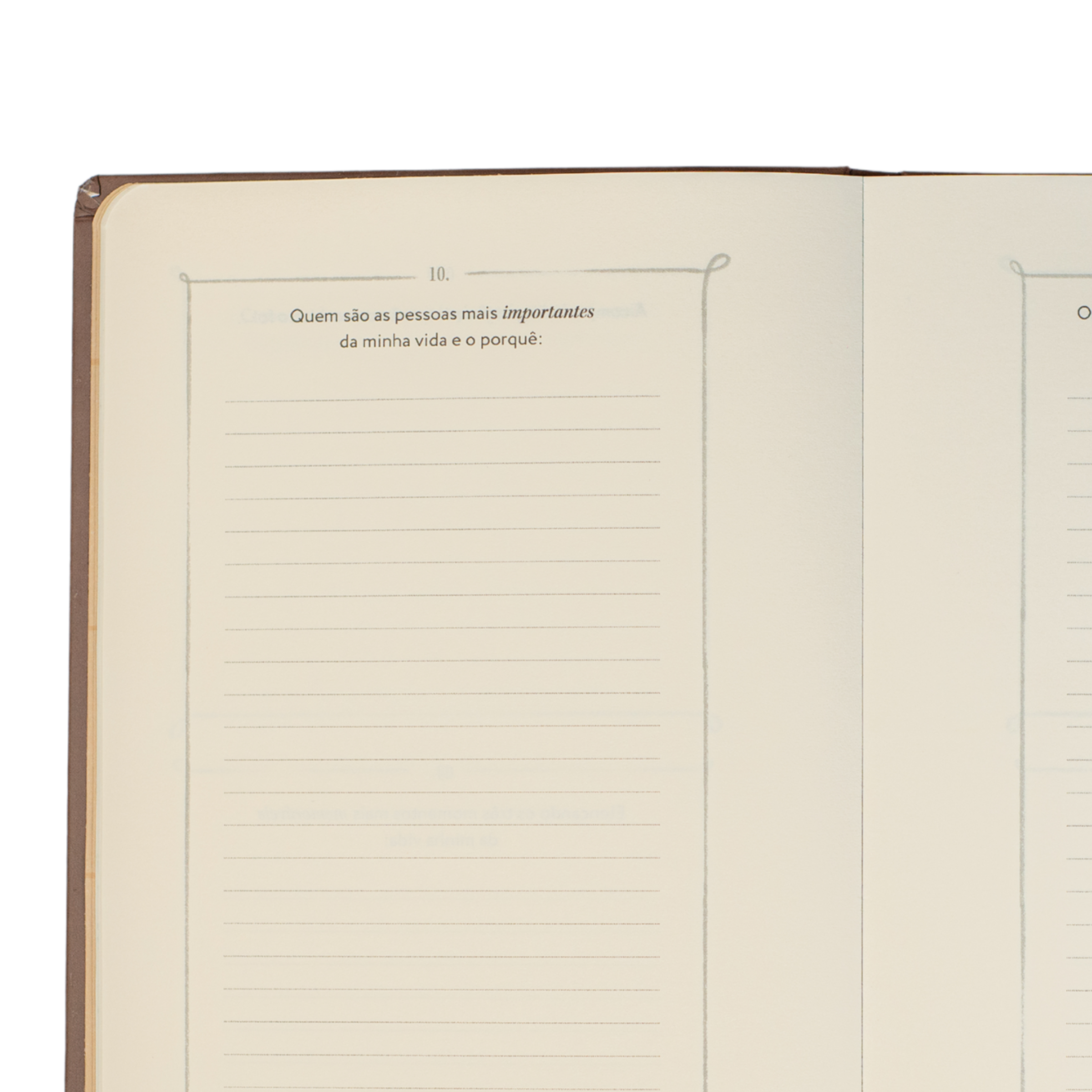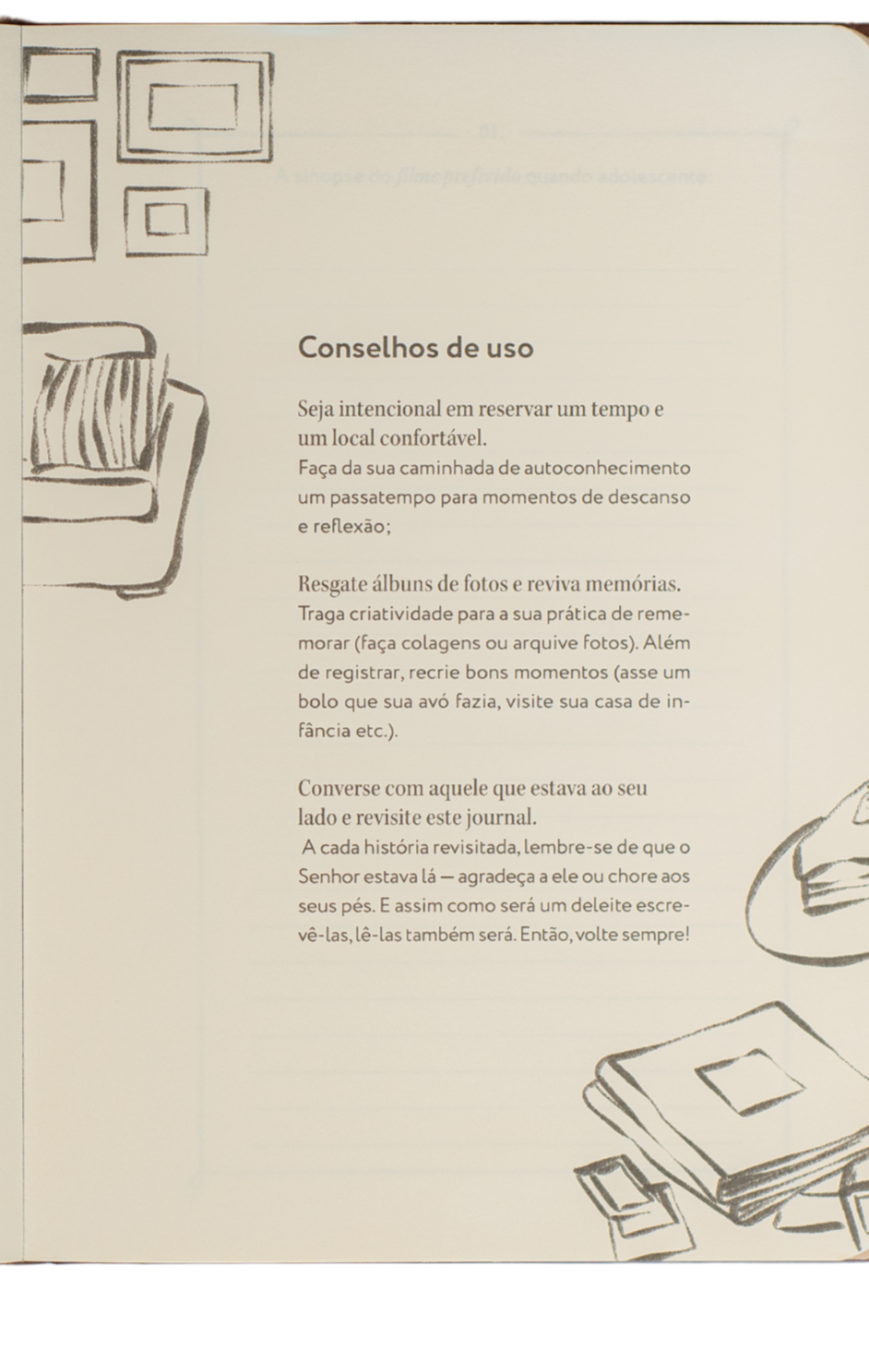 Explore o Journal de Memórias, um instrumento de autoconhecimento cristão, uma forma de revisitar sua história: composto por 100 perguntas inesperadas e criativas sobre sua jornada, infância, adolescência, idade adulta, vida espiritual e momentos marcantes.
