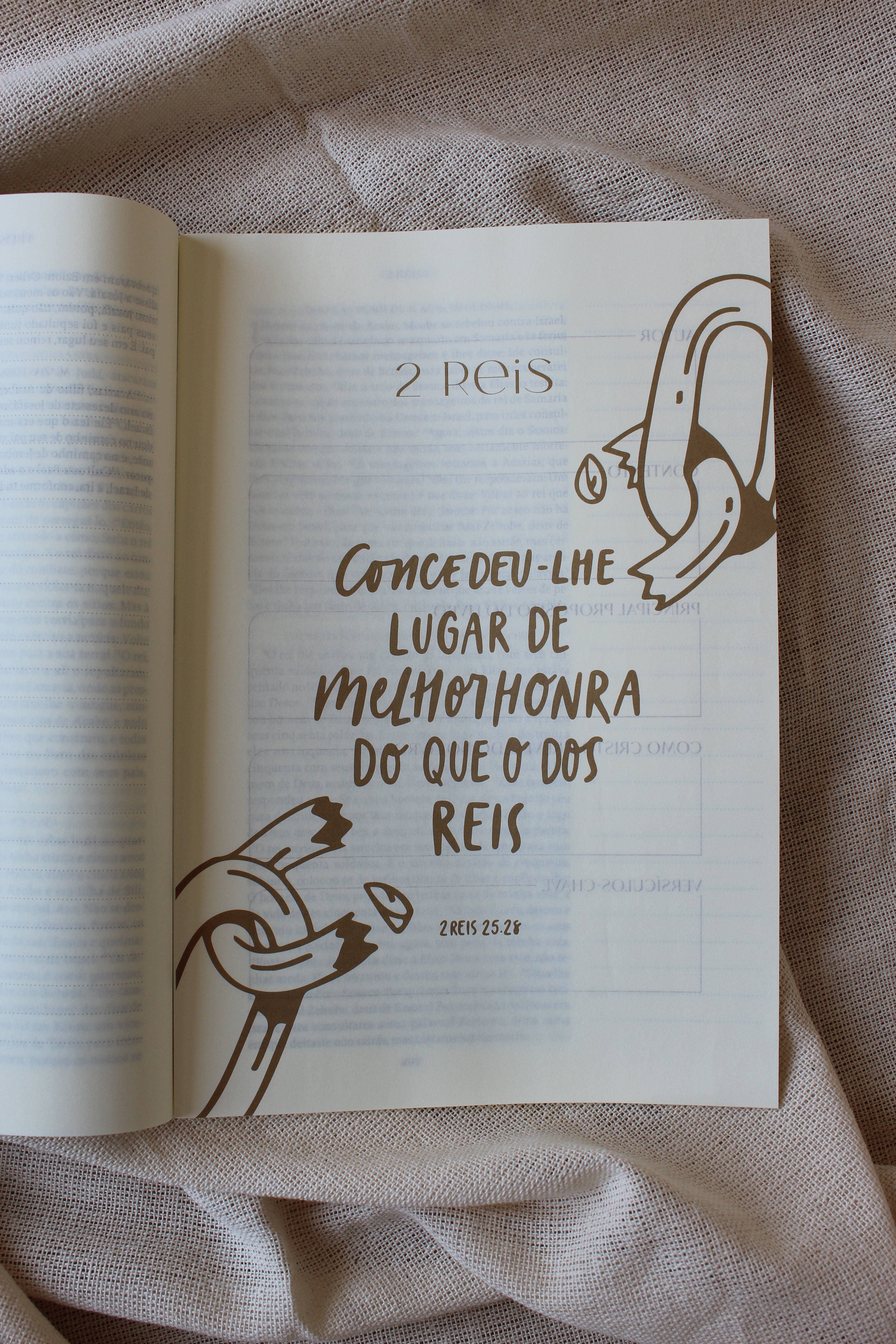 Trazemos a cada livro da Bíblia, uma abertura com ilustração ou lettering autorais, desenvolvidos pelo nosso time de criação, que apontam para como o Senhor Jesus Cristo foi revelado naquele livro. Você poderá meditar nessas artes a cada novo livro!